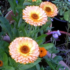 Calendula officinalis 55-60 cm. Maheda aprikoosi värvi täidiskorvikud, mille tumedat südamikku ümbritseb kollane võru. Vananedes muutuvad õied heledamaks. Õielehtede tagakülg ja pungad on purpursed. |
